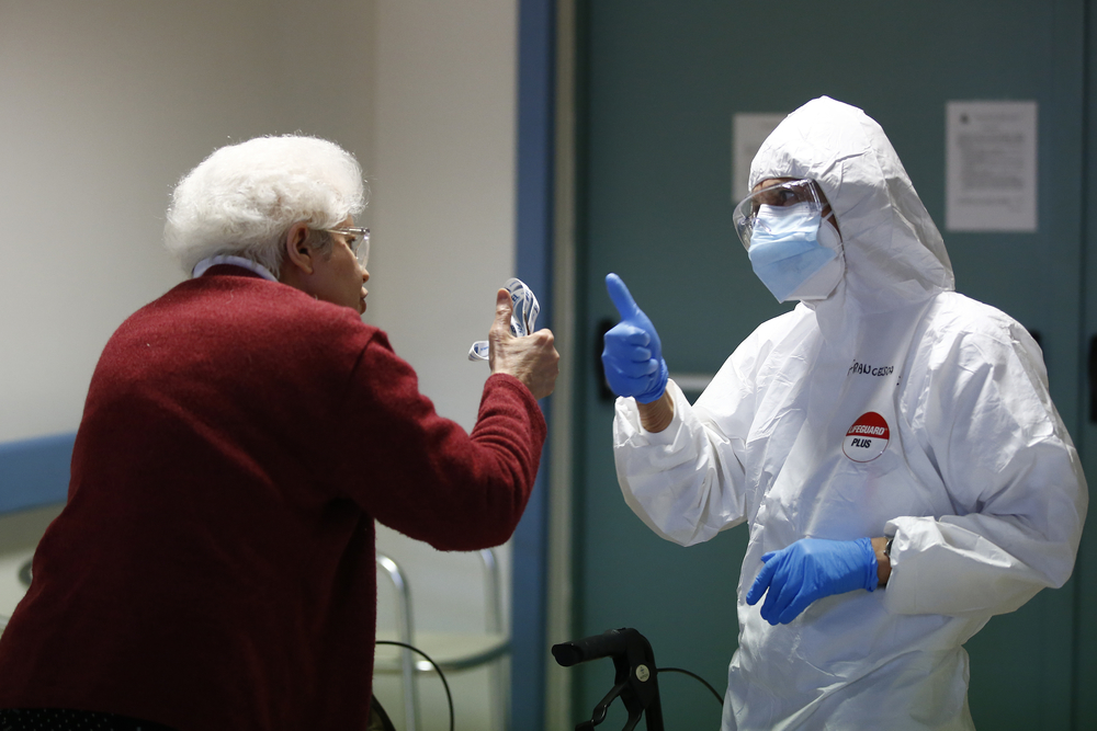 ITÁLIA: conversa em tempos de pandemia viral. Membro da equipe de MSF e uma senhora, em um lar de idosos na região leste de Marche, onde oferecemos assistência médica e implementamos medidas de prevenção e controle de infecções. Abril de 2020.