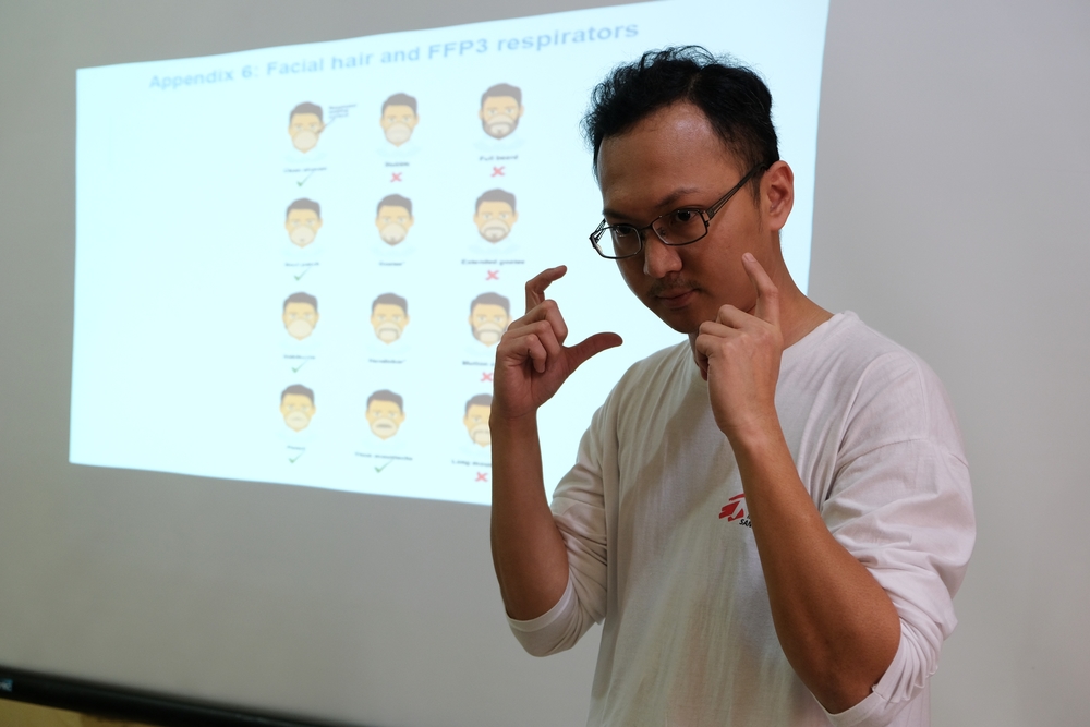 SUDÃO DO SUL: o especialista em água e saneamento Adrien Mahama ensina o uso correto da máscara de proteção, durante um treinamento de prevenção e controle de infecções para a equipe do hospital Al-Sabah, em Juba. Abril de 2020.