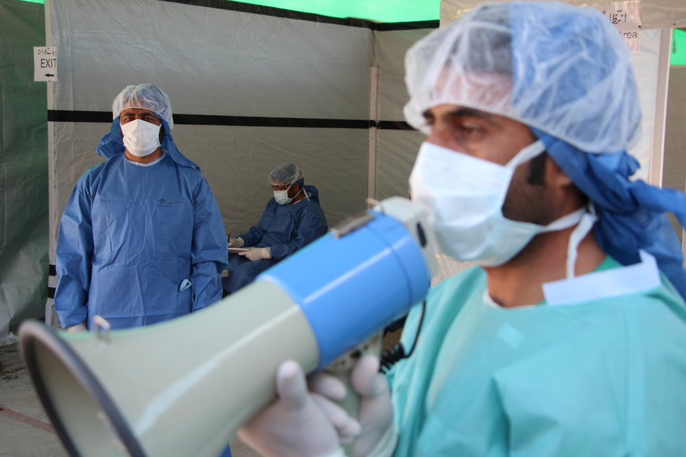 PAQUISTÃO: promotor de saúde de MSF aconselha pessoas sobre formas de prevenção contra a COVID-19 no hospital distrital de Timergara. Instalamos uma tenda para a triagem de pacientes na entrada do hospital, pelo qual cerca de mil pessoas passam todos os dias. Abril de 2020.
