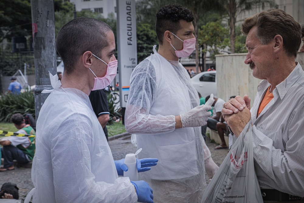 BRASIL: atividade móvel no centro de São Paulo para avaliar e diagnosticar a COVID-19 entre pessoas em situação de rua. Nossas equipes também oferecem consultas médicas e os pacientes com sintomas graves são encaminhados para hospitais. Abril de 2020.