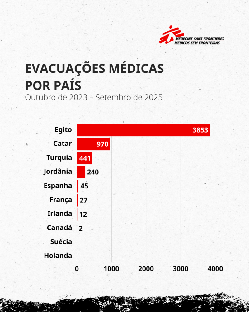 Esses pacientes não podem esperar que o sistema de saúde seja reconstruído – eles precisam de cuidados urgentes agora”, alerta Abdelmoneim. “Entre julho de 2024 e agosto de 2025, pelo menos 740 pacientes, incluindo 137 crianças, morreram enquanto aguardavam evacuação médica. Essas mortes eram evitáveis – causadas não apenas pela destruição de hospitais, mas também pela inércia política.”