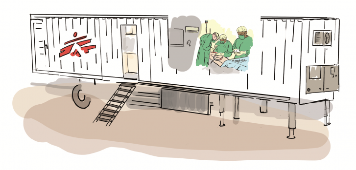 Temos um “centro cirúrgico” sobre rodas, composto por até 16 trailers. Alguns deles são a sala de cirurgia, a UTI ou a farmácia. Outros são para transportar o resto do material que os cirurgiões precisam. O centro cirúrgico pode ficar pronto em três horas e podemos levá-lo a uma zona de guerra. Nós o usamos em Mossul, no Iraque.