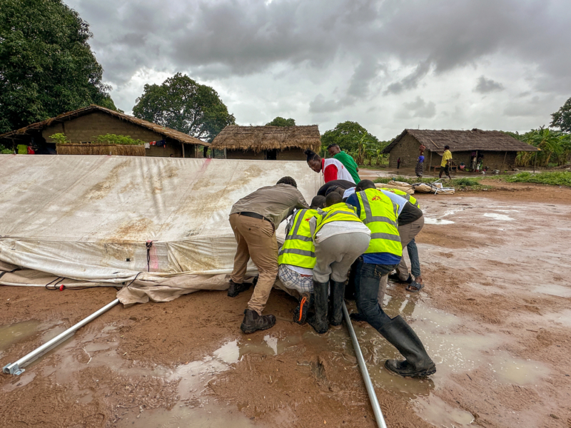 Equipe de MSF monta tenda para ser usada em consultas como parte de uma clínica móvel em Alua Velha, província de Nampula, durante uma pausa após fortes chuvas, em Moçambique. ©Sofia Minetto/MSF