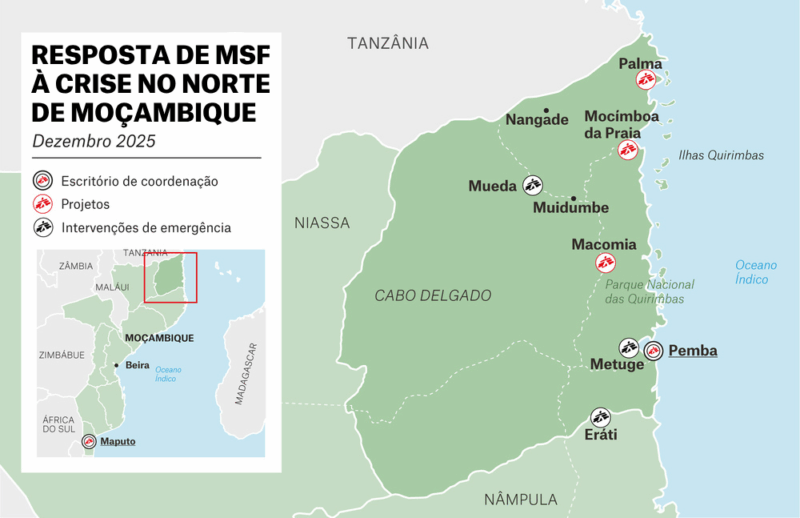 MSF iniciou esta resposta em dezembro de 2025, após a maior onda de deslocamento registrada naquele ano, desencadeada por ataques do grupo armado Estado Islâmico de Moçambique e pelo receio de mais violência.