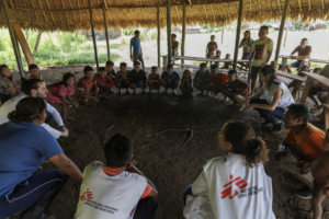 Em 2024, MSF realizou atividades de saúde mental com comunidades Yanomami e Ye’kwana, promovendo bem-estar a partir de uma abordagem integrada ao território. ©Diego Baravelli