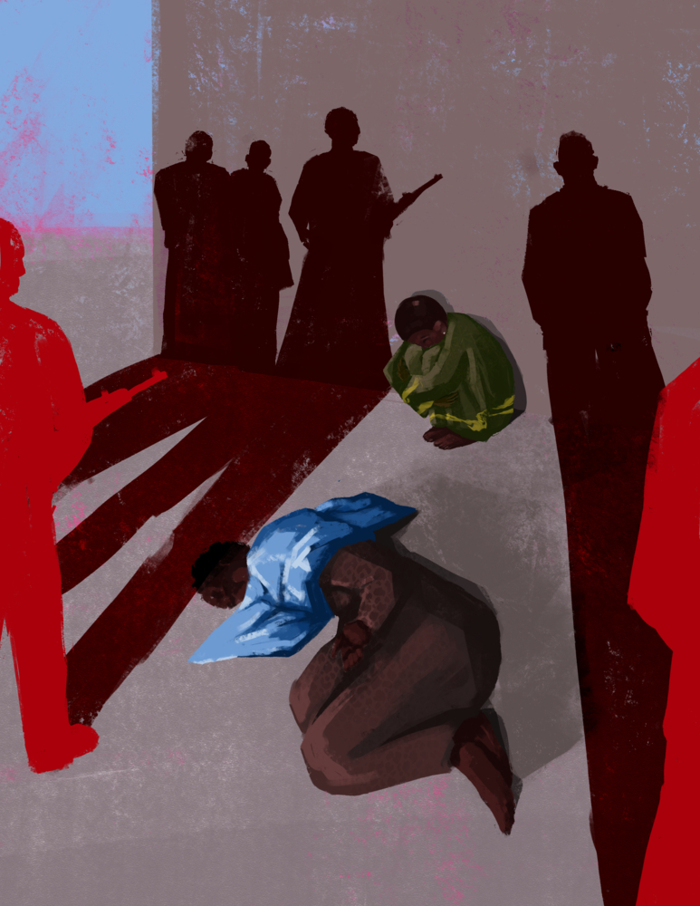 Aqui [no acampamento no Chade], as condições de vida são muito difíceis. Perdemos tudo. Não temos comida nem cobertores. À noite, o clima é muito frio. Um dia, decidi voltar para a Kulbus (Sudão) para ver um parente. Fui com um amigo. Isso foi há três meses. Quando chegamos a Kulbus, vimos um grupo de três mulheres com alguns homens da RSF que as vigiavam. A RSF ordenou que ficássemos com elas.