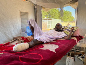 Paciente atendido por MSF após sofrer ferimentos na perna quando uma mesquita em El Fasher foi atacada. Hospital de Tawila, Sudão. ©Natalia Romero Peñuela/MSF
