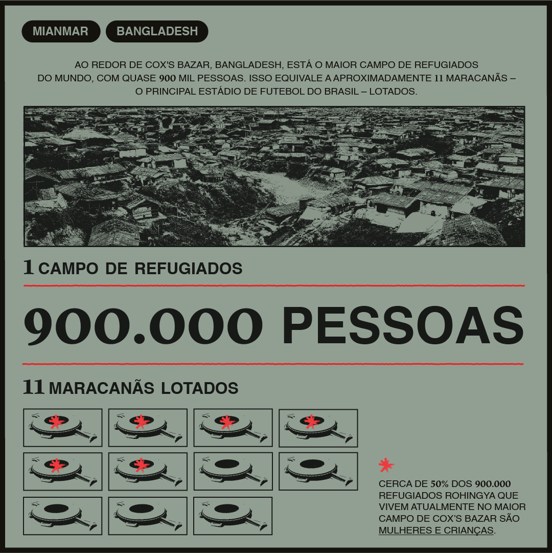 Apesar da crise humanitária envolvendo a população Rohingya em Mianmar não ser recente – com ondas de deslocamentos desde os anos 90 – em 2017, ataques violentos do Estado forçaram milhares de idosos, crianças e mulheres a se deslocar para países vizinhos. Apenas neste ano, cerca de 700 mil pessoas foram forçadas a fugir em busca de um lugar seguro.Após cinco anos, o número de refugiados deixando Mianmar continua crescendo. As consequências desses ataques geram problemas graves a mais de 1 milhão de refugiados que convivem não apenas com o trauma gerado pela violência, mas também pelas condições precárias dos campos de refugiados superlotados em que vivem. Ao redor de Cox’s Bazar, em Bangladesh, está o maior campo de refugiados do mundo*, com quase 900 mil pessoas, sendo cerca de 50% mulheres e crianças.